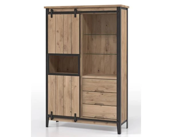 Placé devant un mur clair, ce meuble de rangement sera idéalement mis en valeur. Il habillera l’espace de ses dimensions de L. 120 x P. 42 x H.186 cm. Les murs ou sols foncés lui conviendront aussi parfitement car il les illuminera aisément grâce à son bois. Entre ses portes coulissantes sur rails, ses 3 tiroirs dotés de poignées basses découpées et ses différentes niches de présentation, il permet d’organiser de nombreux objets. Dans votre cuisine par exemple, vous pouvez très bien ranger vos verres sur les étagères de droite, les assiettes et bols dans le module bas et les couverts et le linge de maison dans les tiroirs. Dans le bureau, vos cadres photos trôneront fièrement à côté de vos trophées et les dossiers administratifs et lettres d’amour seront dissimulés des regards indiscrets. Bref, vous l’aurez compris, les possibilités sont nombreuses et ce meuble en chêne massif, MDF et métal est aussi beau que pratique ! Et c’est bien là l’essentiel car meubler son intérieur avec style et commodité nous permet d’être encore mieux chez nous, et oui…
