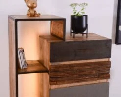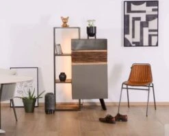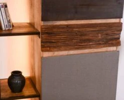 Face à vous, ce meuble présente à gauche une colonne divisée en 3 caissons. Le bois de manguier naturel est sublimé par un encadrement en fer. Vous pourrez facilement y stocker des objets décos, un cadre, des bouquins… Sur la droite du meuble un caisson se farde d’une porte recouverte de métal, de bois exotique surcyclé et de ciment texturé. C’est tellement beau qu’on en oublie presque d’ouvrir la porte pour découvrir un autre module qui sera parfait pour disposer d’autres affaires.
