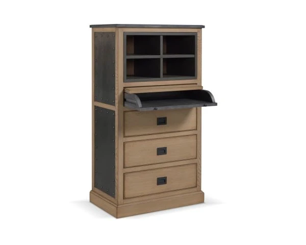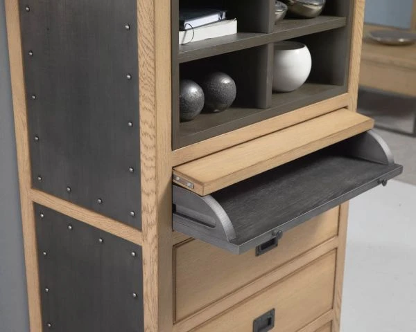 Le style industriel chic se pliera à toutes vos exigences et ce meuble en chêne massif et métal en est la preuve. Issu de la collection « San Francisco » il saura se rendre indispensable et peu importe la place que vous lui destinez. Dans une entrée il servira de meuble d’appui, dans un bureau de taille modeste d’écritoire original, dans une véranda de meuble de rangement… Dans sa partie haute se retrouve un bloc-étagères amovibles gris. Juste en dessous, un petit bureau qui vous permettra de rédiger vos papiers administratifs ou des lettres d’amour enflammées et encore en dessous, trois tiroirs qui sont parfaits pour classer papiers, babioles ou bien d’autres choses encore.
