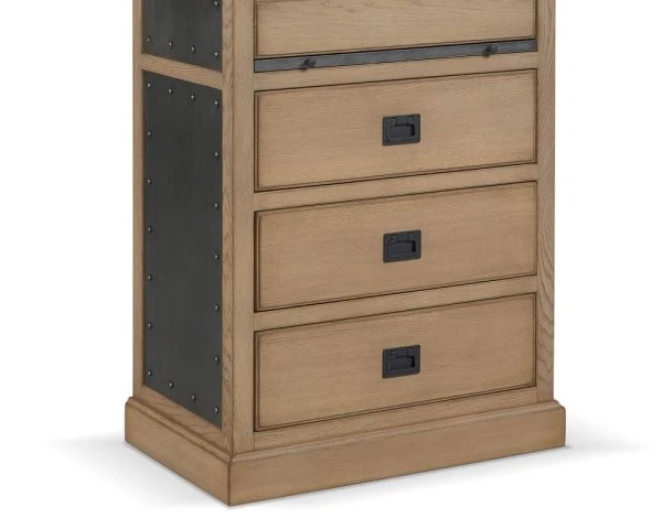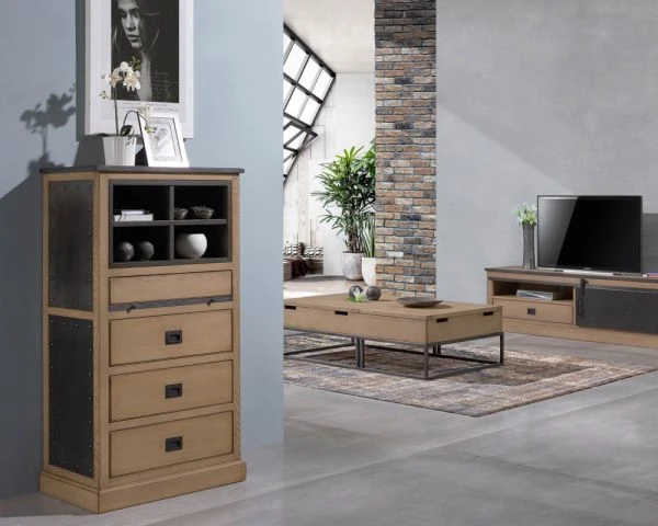 Conçu avec le plus grand soin, dans des matériaux solides et pérennes, ce meuble en bois affiche des références factory et une réalisation élégante. On est fan des détails comme les rivets sur les plaques en métal ou les poignées. Haut de 124 cm, ce meuble organisationnel pourra convenir aussi pour installer une belle lampe à poser, une orchidée majestueuse, une sculpture ramenée d’un de vos voyages… Large de 68 cm et profond de 42 cm, ce meuble de complément permettra aussi de meubler les petits espaces que vous ne saviez pas comment optimiser jusqu’à présent.