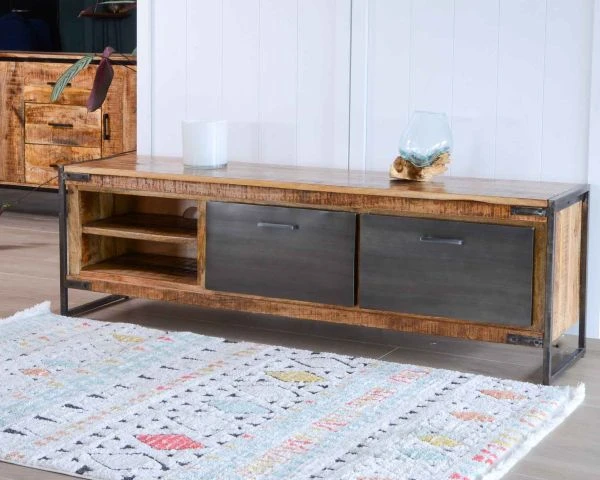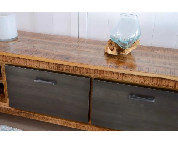 Mariant habilement un caisson réalisé en bois massif et des pieds en métal, le banc TV avec rangements « Shade » a un charme fou. Chez Meuble House on adore ses finitions plus ou moins brutes laissées apparentes et qui apportent une personnalité subtilement vintage. On a l’impression d’un meuble chiné avec du vécu mais il n’en est rien. Il est bien neuf et n’attend que d’être installé dans votre salon. Ses teintes de bois miel plus ou moins foncées sont 100% authentiques et sont ponctuées naturellement de stries plus foncées. L’essence de manguier est très facile à vivre et diffuse une note d’exotisme à votre séjour. Léger, c’est un bois très résistant qui permet de réaliser des meubles solides et pérennes. Ainsi, vous profiterez de très nombreuses années de votre meuble de 50 x 160 x 40 cm (H.xL.xP.).