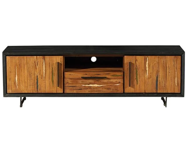 Mêlant l’aspect brut du métal au côté chaleureux du bois de bateau recyclé et du bois waru teinté noir, ce meuble tv est un exemple de raffinement et de modernité