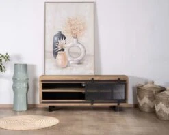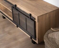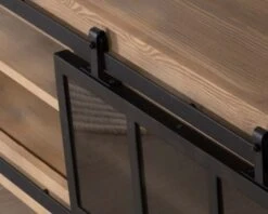 Matières : Pin massif brossé, métal, verre fumé, MDF laqué noir