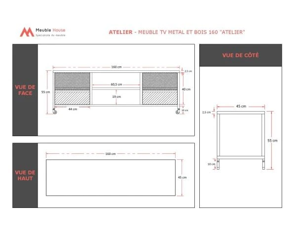 Fonctionnel, ce meuble de télévision aux dimensions confortables (L.160 X H.55 X P. 45 cm), optimise la surface murale autour de l’écran et dispose d’espaces de rangement pour accueillir vos équipements.