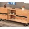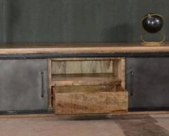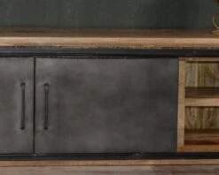Avec ce meuble TV en bois massif manguier et métal vous êtes certains d’apporter du caractère à votre intérieur ! Ses couleurs métal gris/noir et bois naturel finition miel s’harmoniseront à souhait avec une décoration industrielle. Ce meuble solide est idéal pour recevoir un grand écran plat et autres objets high-tech. Il convient aussi bien aux salons spacieux à l’ambiance minimaliste qu’aux espaces plus petits et optimisés.