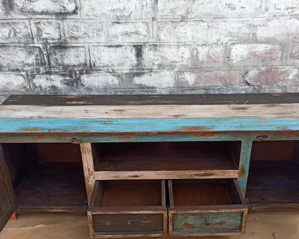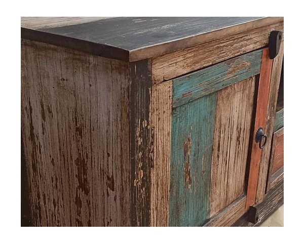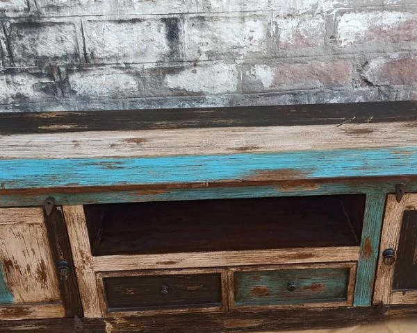 Mais le côté pratique du meuble télé « Cookies » est loin d’être son seul atout ! Entièrement réalisé en manguier massif, un bois particulièrement robuste, ce meuble TV a été volontairement vieilli à l’aide de peinture colorée. Chaque meuble s’avère unique, tantôt avec des nuances de bleu et de noir, tantôt avec des nuances de rouge orangé, de beige et de marron… Autant vous dire que votre nouveau meuble télé attirera immédiatement l’attention, et d’autant plus si vous le complétez avec d’autres éléments de la collection « Cookies » comme un buffet ou une console.