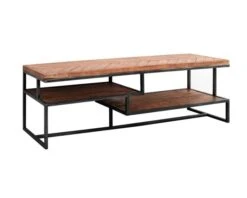 Le plateau à motif chevrons et les étagères suspendues sont recouverts de bois exotique massif qui se marie parfaitement avec la structure en métal. Le tout pour produire une combinaison unique en son genre. Grâce à son association très sobre de matériaux, ce meuble TV saura aisément se combiner avec de nombreuses couleurs de décoration ainsi qu’à des styles d’intérieurs variés : contemporain, scandinave, moderne ou rustique, tout lui va ! Ce meuble s’adaptera sans problème à votre créativité et votre imagination débordante !