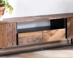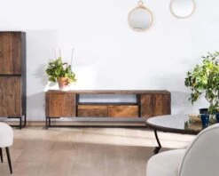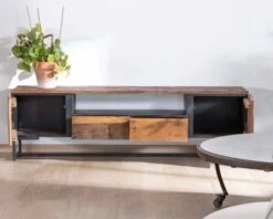 Vos soirées télé se parent d’une atmosphère douce et enveloppante grâce à ce meuble TV en acacia au style industriel rétro « Cachou Chic ».