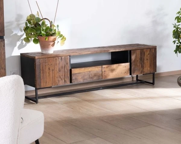 Proposant une longueur impressionnante de 175 cm, une profondeur de 40 cm et une hauteur de 53 cm, ce meuble TV révèlera toute sa majestuosité dans un vaste salon à la décoration industrielle épurée et affirmée, apportant une sensation d’amplitude à votre espace.