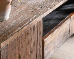 NB : Du fait de l’usage de bois recyclé, le plateau et les façades présentent une finition non lisse, des aspérités, des fissures et des petits défauts qui font partie du charme du meuble.