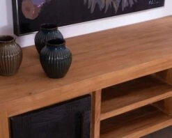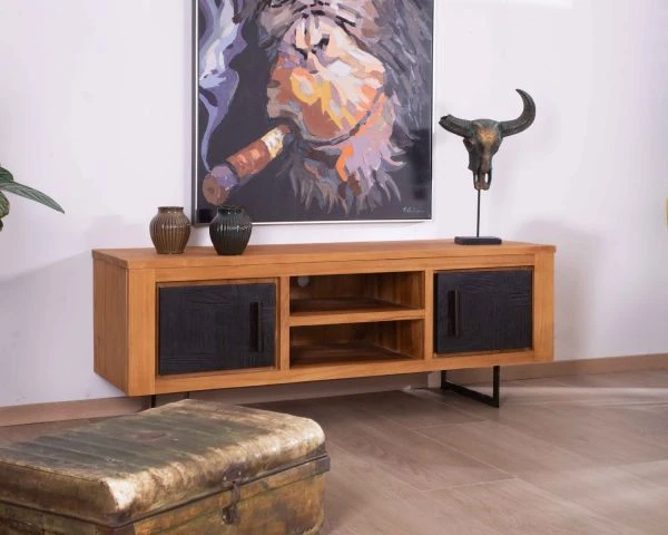 Long de 150,5 cm, profond de 46 cm et haut de 55,5 cm, ce meule TV en bois recyclé trouve sa place dans les petits espaces cosys qu’il modernisera par sa teinture noire. Les pièces de vie plus spacieuses trouvent aussi leur compte avec ce meuble présentant une couleur naturelle hyper chaleureuse. Traité en bi texture, le bois recyclé capte la lumière de manière élégante pour un résultat impeccable. Quelques objets décoratifs dans des tonalités olive foncé ou bronze donneront le ton d’une ambiance aux accents mexicains. Si vous optez pour des vases jaunes ou terracota, vous voilà parti dans les terres africaines… En bref, amusez-vous à changer le look de votre pièce avec des accessoires, votre meuble fait le reste. Tel une toile vierge, il est le fond assuré d’une créativité sans limite.