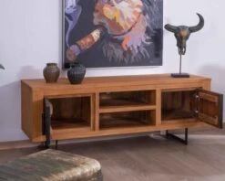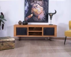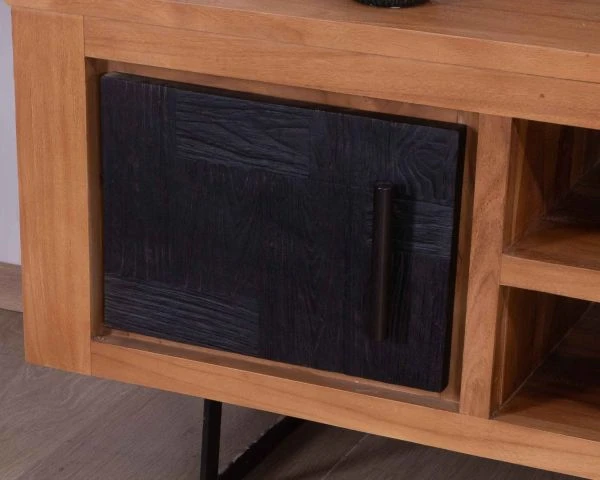 Conçu en métal et teck massif recyclé, ce banc TV a tout d’un grand. Déjà, sa réalisation soignée et ensuite son design tendance qui passera l’épreuve du temps sans encombre. Sur ses deux pieds robustes en fer noir, le meuble en bois semble flotter en plus de vous simplifier le nettoyage de vos sols (autant joindre l’utile à l’agréable…). De chaque extrémité vous retrouverez une porte avec poignée métal s’ouvrant sur un caisson assez spacieux. Tout ce qui doit rester à l’abri du passage et de la vue sera parfaitement rangé de cette manière. Au centre, deux niches permettront d’installer vos revues et votre lecteur DVD. Avec un trou de passage assez large, les prises de vos appareils se faufileront aisément à l’arrière du meuble pour se faire discrètes.