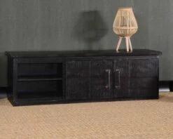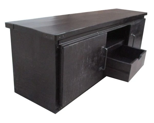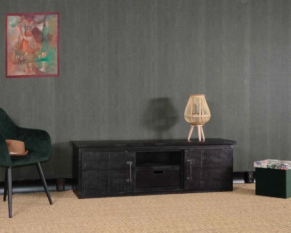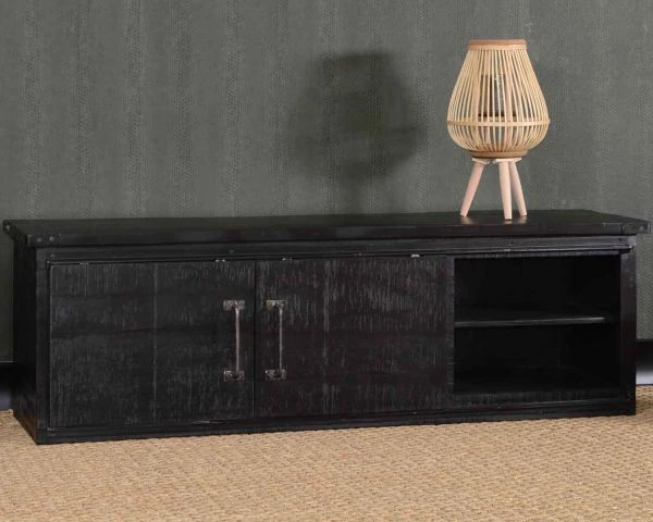 Êtes-vous à la recherche d’un nouveau meuble tv ? Ce meuble télé noir, de 160 cm de long pour 50 cm de haut et d’une profondeur de 40 cm pourrait correspondre à vos attentes. Composé de bois massif, de bois exotique et de métal, son apparence pourra apporter élégance et raffinement au reste de votre salon. Vous aurez ainsi un meuble unique et particulier : les imperfections du bois et du traitement du métal y sont intactes et font partie de la conception de ce meuble et lui donnent toute sa force. Appartenant à la collection « Caractère », ce meuble présente des détails qui lui confèrent toute son âme et son apparence si particulière.