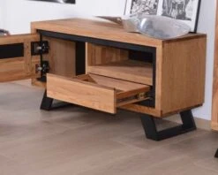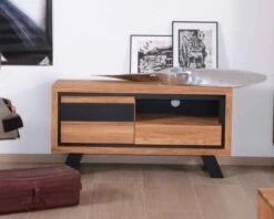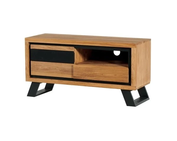Très graphique visuellement, ce petit meuble en bois profite d’un look design facile à vivre. Le noir des pieds et des détails renforce la puissance décorative du bois naturel vous ne trouvez pas ? Question rangement, vous aurez aussi de quoi faire avec ce meuble TV de 114 cm de long, de 53 cm de haut et de 40 cm de profondeur. La niche ouverte dispose d’un trou passe câbles pour lisser courir les fils de vos appareils au dos. Le tiroir monté sur rails métal à ouverture totale vous permettra de ranger vos télécommandes et manettes de jeu pour toujours savoir où elles se trouvent. La porte à frein pour sa part vous permettra de ranger vos DVD, quelques jeux de société…