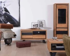 Dynamisez votre déco et votre ameublement grâce au style moderne de ce meuble TV naturel et noir. La collection « Toly » a été conçue spécialement pour les amateurs de bois qui souhaitent des meubles tendances avec une pointe d’authenticité. Réalisé en chêne massif huilé et MDF teinté noir, ce meuble composé d’une niche , un tiroir et d’un caisson fermé par une porte ne manquera pas d’apporter du caractère à votre séjour.