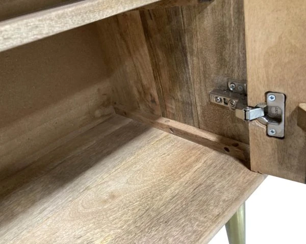 Les nuances miel plus ou moins foncées du boit exotique permettent d’apporter une note chaleureuse et pleine de charme à votre intérieur. Esthétisme et praticité se combinent de façon harmonieuse. Le tiroir de votre meuble de rangement est monté sur coulisses bois et il est très agréable à manipuler. Derrière les deux portes avec poignées bouton se cachent deux grands casiers séparés par une étagère. A noter l’absence de montant central qui vous empêcherait de ranger de longs plats de service. Trop pratique ! Et en bonus, un meuble surélevé qui vous simplifiera le ménage. Aucune difficulté pour passer l’aspirateur sous votre ameublement…