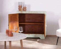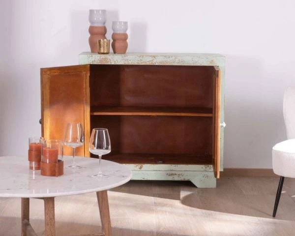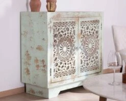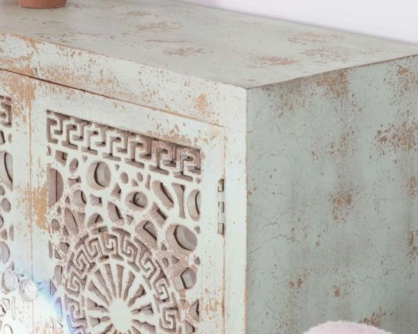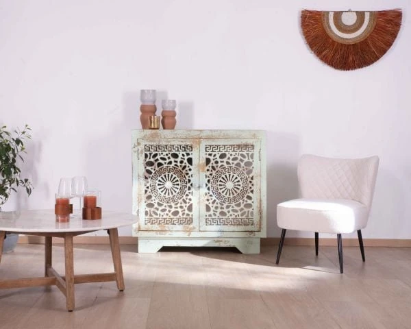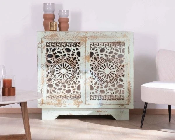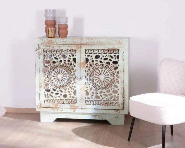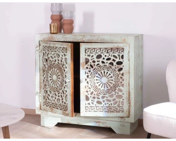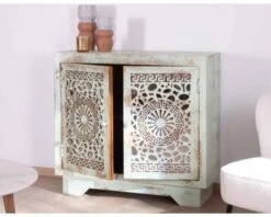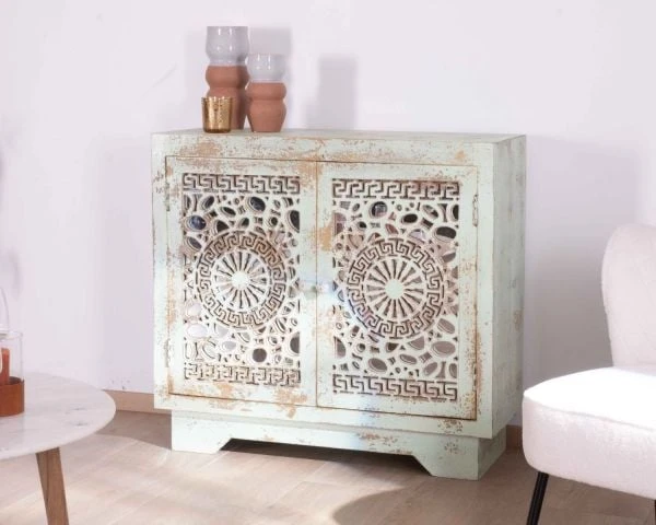 Totalement conçu en bois massif et à la main, ce petit buffet 2 portes à l’esprit mandala vous aidera à meubler votre intérieur de façon douce mais surtout pratique. On craque pour ce bahut bas à la nuance claire qui laisse apercevoir la teinte naturelle du bois exotique par endroit. Faussement vintage, ce meuble en bois sculpté artisanalement apportera une pointe d’orientalisme chic à votre cuisine, salon, entrée… Sur son plateau pourquoi ne pas installer un souvenir de voyage pour vous accueillir ? Et avez-vous remarqué les miroirs incrustés derrière les découpes qui jouent avec la lumière ?