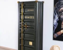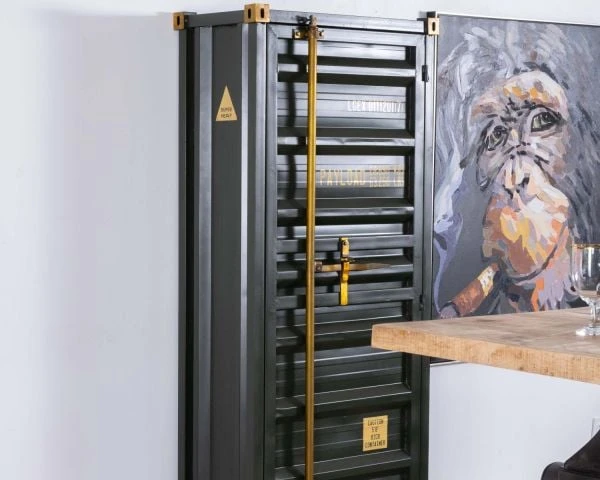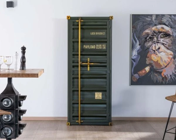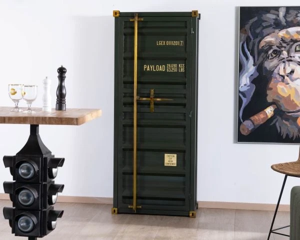 Long de 72 cm sur 178 cm de hauteur, ce meuble de rangement allie une grande fonctionnalité et une esthétique originale et affirmée. Dans cette couleur vert kaki, paré d’inscriptions doré à l’image des conteneurs de transit, ce meuble de bar en métal évoque des périples lointains et installe une identité robuste et voyageuse à votre décoration intérieure.