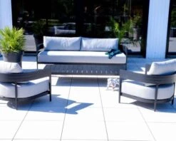 Pour profiter d’un salon extérieur stylé, le design de la gamme « Blois » vous séduira à coup sûr. On craque pour la structure du canapé et des deux fauteuils en aluminium anthracite et pour les coussins gris clair. Le rendu des matériaux tout comme leurs performances techniques sont le reflet de leur personnalité pleine de charme et de caractère.