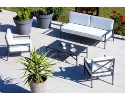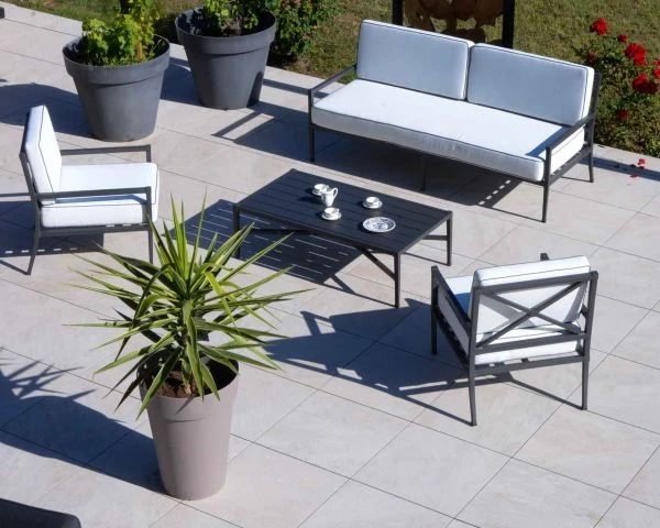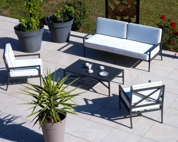 Garnis de mousse antimicrobienne, les deux fauteuils 1 place et la banquette 3 personnes respirent. La condensation est évitée, les meubles sèchent en un temps record même après une bonne averse. Revêtus de tissu performant et hydrofuge Sunproof, les assises sont traitées aussi contre les taches. Le textile s’entretiendra facilement si vous le frottez à l’aide d’une brosse douce et d’eau savonneuse. Un rinçage à l’eau claire et un séchage à l’air libre et vous retrouverez votre mobilier comme neuf.