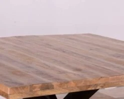 Avec ses dimensions de 140x140x77 cm, elle sera tout aussi conviviale qu’une table ronde mais franchement plus contemporaine. Avec des chaises du même style ou mixées pour un effet « brocante » vous pourrez installer entre 4 à 8 personnes autour de son plateau. Ses pieds larges et croisés en métal noir ne gêneront pas les jambes de vos amis et ils assureront aussi la stabilité de votre solide table.
