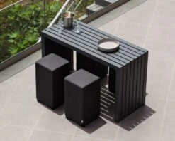 Avec une allure singulière et contemporaine ainsi qu’une structure design en aluminium noir, votre bar extérieur affirmera votre goût confirmé pour l’ameublement outdoor de caractère et de très belle fabrication. Il saura faire preuve d’élégance et de style dans votre jardin et il vous permettra de recevoir vos amis avec plaisir. Sobre tout en étant singulière, la table haute d’extérieur « Java Island » se veut aussi à la fois exceptionnelle et ergonomique.
