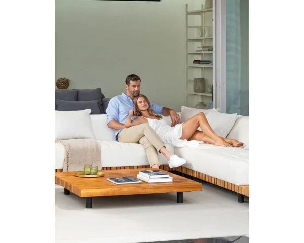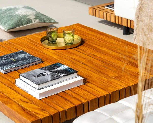 Avec ses pieds en aluminium noir et son bois précieux et imputrescible elle est très résistante. Vous pourrez la laisser dehors sans problème. Sa couleur riche et le veinage de son bois donneront un côté chaleureux à votre terrasse. Avec le temps, votre table peut se patiner et devenir légèrement grisée surtout si elle est exposée au soleil. Votre meuble possède alors sa propre histoire, sa propre authenticité. L’extérieur devient une vraie pièce de vie et votre nouvelle table de salon outdoor fera sensation auprès de vos proches. Elle possède aussi un côté ethnique chic, on se croirait sur une plage d’Asie… Le bruit des vagues en plus, ça y est, vous êtes en vacances !