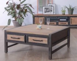 Les tables carrées sont très tendances, très actuelles. Elles sont plus modernes que des tables rondes et plus compactes que des tables de salon rectangulaires. Conçue dans un style résolument factory, la table « Saturne » vous présente sa structure en métal brut et son plateau et ses façades de tiroirs en bois de manguier massif à l’aspect teck et au toucher sablé. Le gris soutenu du métal se marie à merveille à la teinte chaude du bois exotique vous ne trouvez pas ?