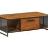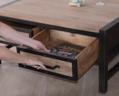 Livrée déjà assemblée, cette table en bois et métal sera un meuble facile à vivre. Traitée pour durer, elle peut éventuellement être cirée 1 ou 2 fois par an avec un produit naturel adapté. Dans ce cas, appliquez toujours votre cire dans le sens du bois pour un résultat optimal. Avec ses pieds surélevés de 22 cm, elle vous simplifiera aussi le ménage. Et avec ses 4 tiroirs, les télécommandes, bouquins et paquets de mouchoirs (ou de bonbons ça marche aussi…) seront bien stockés, toujours à disposition.