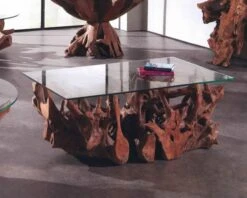 Le contraste entre le caractère épuré du verre et les lignes sauvages du bois, fait de cette table basse, un meuble raffiné. Il deviendra à coup sûr une pièce maîtresse de votre salon ou de votre balcon. De plus, la délicatesse et le côté chaleureux du bois exotique teinte miel viennent compenser l’uniformité et la dureté du verre. Ce mélange des genres fait de cette table de jardin un objet au design résolument contemporain et original. Avec son plan horizontal marqué par le plateau en verre de 120×80 cm et la verticalité de sa base en racine naturelle (+/-55cm) votre table vous permettra d’avoir assez d’espace pour poser le café de vos invités et des réductions sucrées et salées pour un après-midi détente au bord de la piscine ou dans votre véranda.