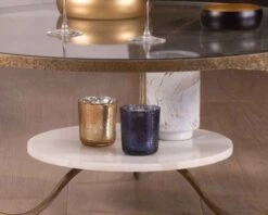 La table basse deux plateaux « Gilt Antique » assume pleinement sa forme ronde et épurée et saura mettre en valeur toute la sophistication et l’élégance de votre espace salon. Avec son plateau supérieur en verre trempé, son plateau inférieur en marbre blanc et sa structure en métal travaillé, cette table ronde ajoutera du charme et une pointe de modernité à votre coin détente. S’inscrivant dans un esprit glamour chic, cette table design est un ravissement pour les yeux.
