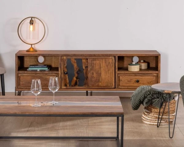 Au cœur de votre lieu de convivialité, installez une atmosphère envoûtante qui subjuguera vos invités avec la table de salon rectangulaire en acacia, résine et métal de la collection « Membatu ».