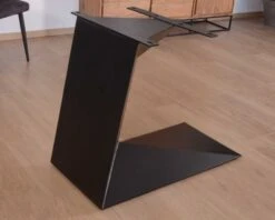 Vu de profil on image le bras et la main du serveur Ruben portant son plateau pour vous apporter vos conso… Mariant un pied ultra graphique et moderne à un plateau 100% naturel en bois d’acacia, la table de repas « Ruben » est aussi visuelle que fun mais pas que…
