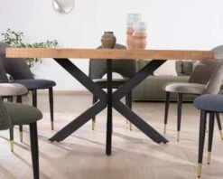Dans une salle à manger contemporaine, l’originalité intrinsèque de cette table en bois et métal apportera une convivialité aussi évidente qu’élégante grâce à son piètement moderne en métal noir d’une part et à la chaleur naturelle de l’acacia massif d’autre part. Dans ce style d’ambiance, misez sur des chaises colorées en tissu qui contribueront à la douceur visuelle et au confort tout en dynamisant et en égayant l’ensemble