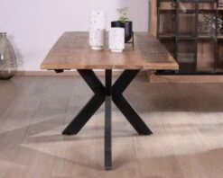 Le plateau de bois de 3 cm d’épaisseur et les pieds de type étoile assurent un aplomb et une solidité sans fausse note. La couleur miel du bois ponctuée de délicates et fines stries brunes se conjugue harmonieusement au métal noir pour un combo gagnant. Matière naturelle et matériau manufacturé s’assemblent avec grâce et élégance pour s’harmoniser avec de nombreux types d’intérieurs. Vous pourrez contempler le veinage organique et subtil et de cette essence d’arbre tropical sans être nullement déçus. La beauté de la nature authentique et pure se retrouve sur votre nouveau meuble de cuisine ou de salle à manger.