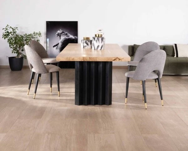 Mesurant 220 cm de long par 100 cm de large, le plateau en acacia massif de 6 cm d’épaisseur est porteur de générosité, d’une chaleur accueillante et d’une authenticité séductrice qui pourra accueillir une tablée de 8 à 10 convives. Cette sensation est renforcée par la finition lisse et huilée du bois dont le veinage vivant et riche de nuances variées captive le regard et diffuse une énergie mêlant la force et la sérénité.