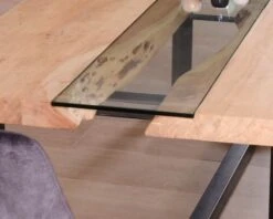Quel plaisir de dresser le couvert sur une table aussi originale qui regroupe des matériaux diamétralement opposés mais qui sont réunis ici pour un résultat impeccable. On craque pour les deux panneaux de bois massif d’acacia qui présentent la forme naturelle de l’arbre. On profite d’une large bande en verre sécurit qui modernise l’ensemble du plateau. On est subjugué par la forme graphique et originale du piétement en métal noir avec une section ample et qui assure l’aplomb parfait de cette grande table de 240 cm de long. A coup sûr, ce meuble de réception ne manquera pas de susciter l’admiration de vos invités et vos plats et autres gourmandises seront à l’honneur, bien disposés sur votre plus beau service en porcelaine ou en grès.
