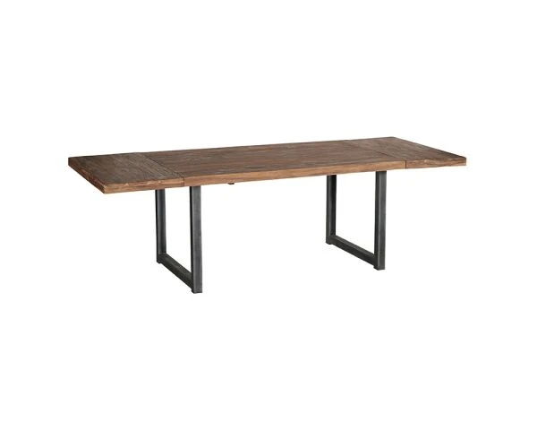 Table de repas de 160 cm en teck avec deux allonges de 50 cm à ranger séparément, possédant un piètement métal.