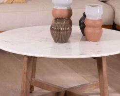 La table basse « Lor » apportera tout son charme à votre salon. On craque pour son contraste entre les pieds en manguier massif façon noyer clair et le plateau en marbre de Banswara.