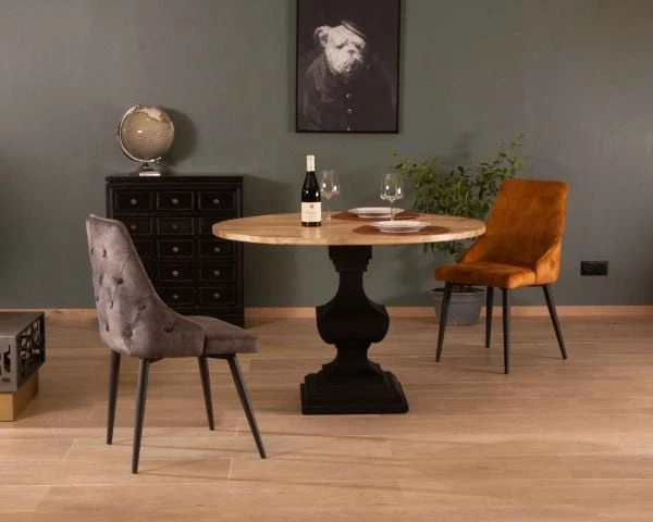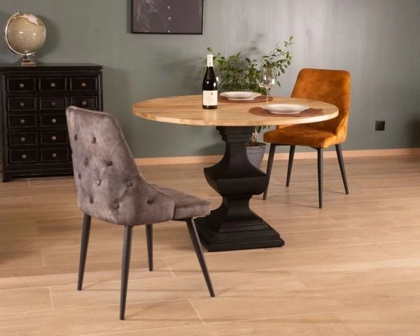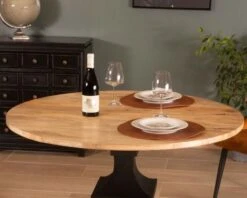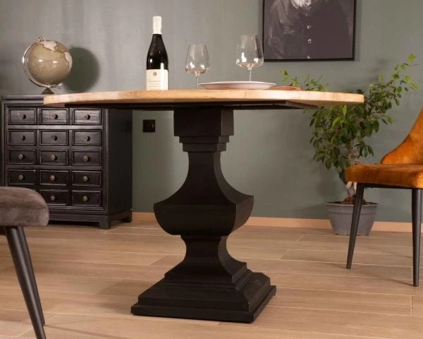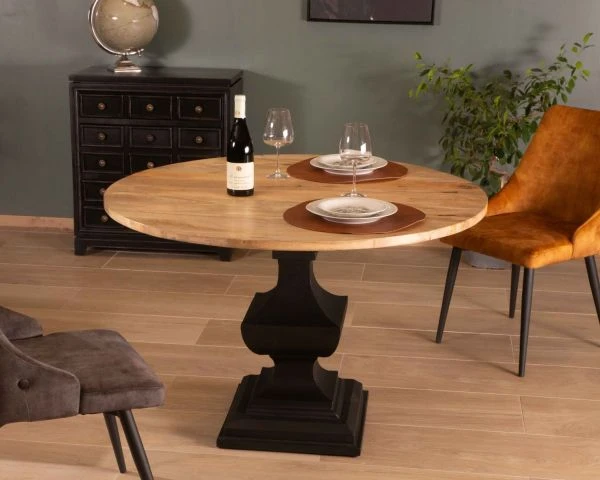 On adore sa réalisation en bois massif de manguier garantissant sa pérennité et sa robustesse. Le pied central ne gêne en rien les jambes des convives qui partagent un repas digne d’un grand chef ! Les tables rondes en bois en plus d’afficher un côté chaleureux permettent à vos invités de se faire face tout en rendant l’instant moins formel, plus convivial. Dans la salle de réception de votre gîte ou de votre domaine, cette table bicolore apportera beaucoup de personnalité à votre décoration. Vous pourrez facilement organiser des événements tels que des mariages ou des rendez-vous d’affaires autour de ce meuble traditionnel. Une vaisselle noire pourra par exemple faire le rappel de la teinte du pied. Quelques touches de couleur apportées par des serviettes en lin ou des fleurs fraiches ponctuées de fils dorés ou argentés sublimeront le tout.