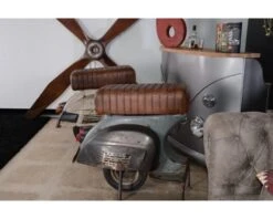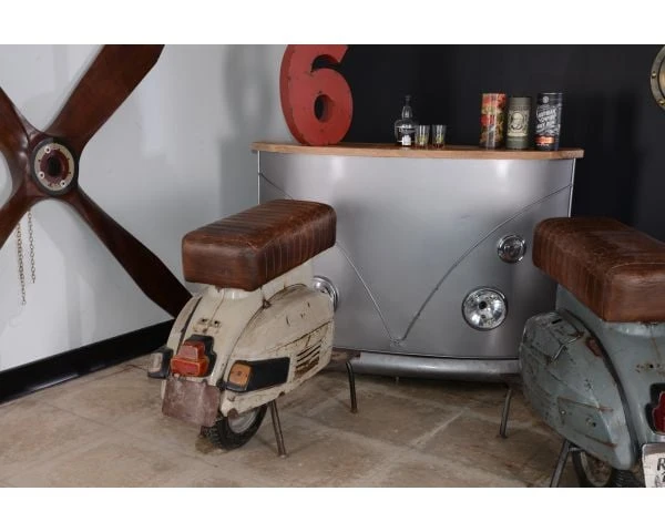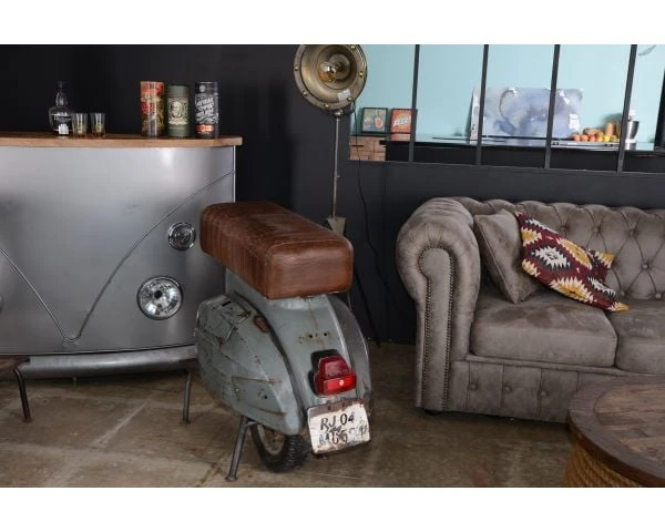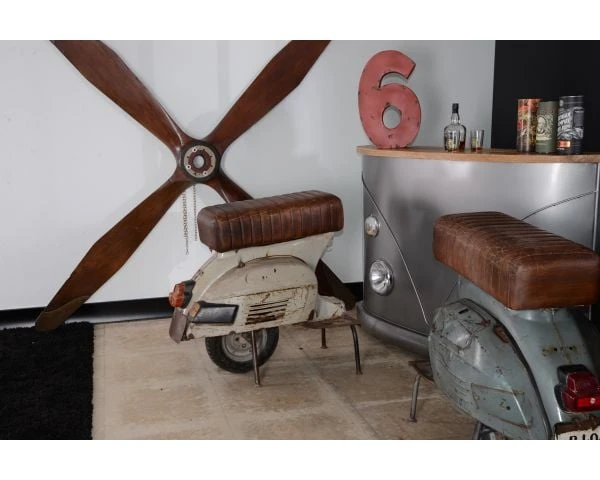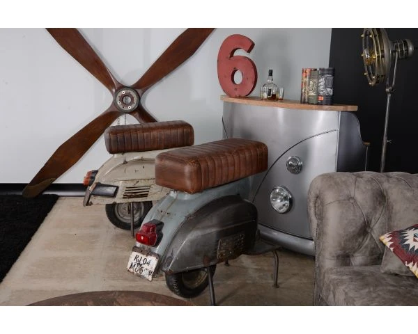 Le Vespa est sans nul doute le plus mythique des scooters, imaginée par Piago en 1946. Ce tabouret se compose de l’arrière d’une vespa du milieu des années 50. Il possède une calandre en métal effet rouille et une selle longue et large en cuir vieilli. L’assise est assez haute et rembourrée avec des finitions en couture sellier pour ajouter de l’élégance. Les ailes sont fuselées et agrémentées de conduits de ventilation. Ce siège possède des reposes pieds apportant plus de confort et quatre pieds pour une stabilité maximale. D’une hauteur de 89 cm, et tout en arrondi, ce meuble très ergonomique se positionne parfaitement le long du bar.